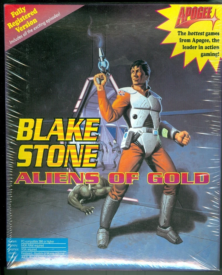 Blake Stone: Aliens of Gold was developed by JAM Productions and published by Apogee Software in 1993. Using the Wolfenstein 3D engine, it instead presented a pulp science fiction spy aesthetic. It was followed up with Blake Stone: Planet Strike in 1994.