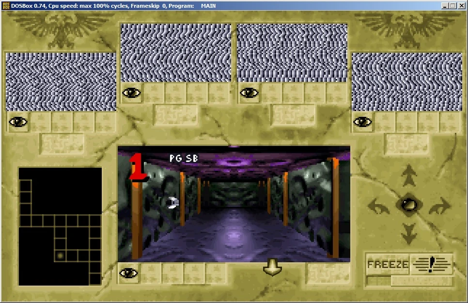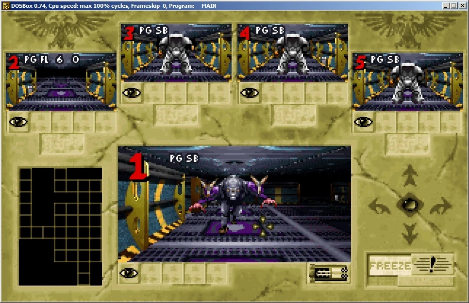The game was played from a grid-based first-person perspective but was team based. You control a group of Space Marines in a series of mission moving through a derelict spaceship. You can see each marines view through cameras and you have an overhead map. It is also possible to switch to an overhead view to see where all your marines are.