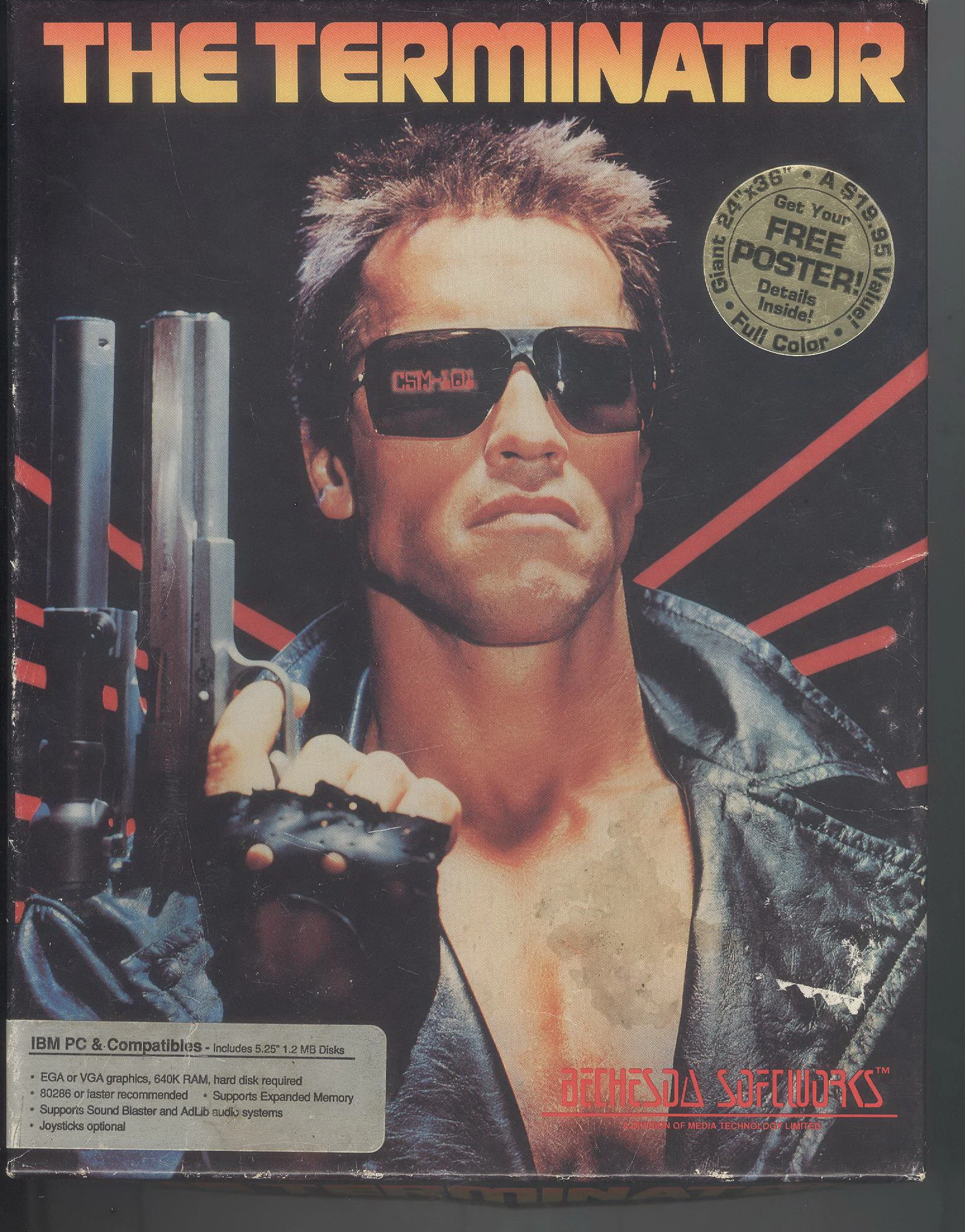 The Terminator was developed and published by Bethesda Softworks in 1990 for MS-DOS, based on the 1984 film The Terminator. Although an action-adventure game viewed in first-person, it is more similar to a vehicular combat game than a modern first-person shooter, somewhat similar to Hovertank 3D. The original boxed retail disc contained a 5 1/4 inch floppy disk. Bethesda released several more Terminator games through the decade.